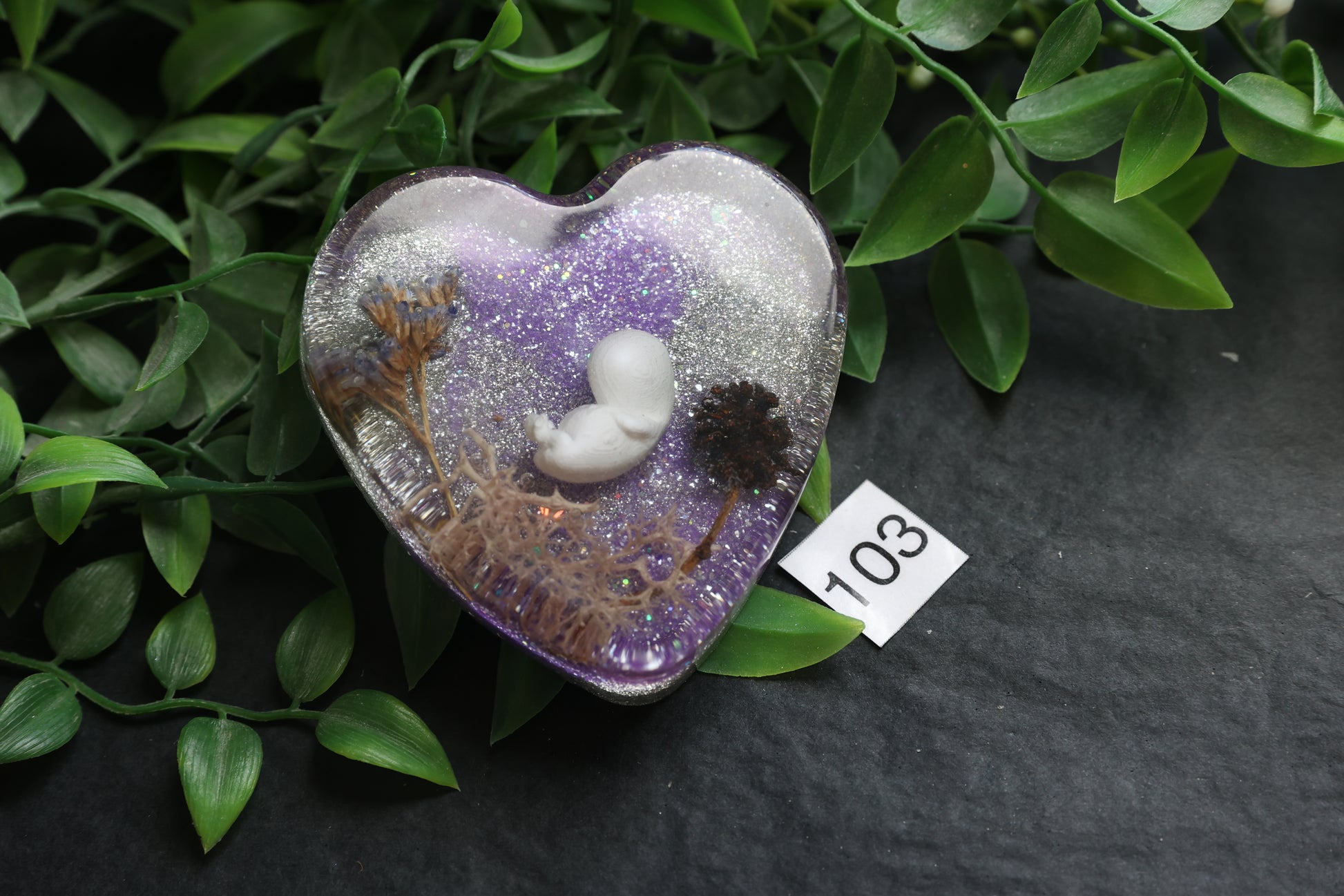 This beautiful piece is a remembrance piece, carefully crafted to represent the exact size of a 9 week baby at their gestational week inside a 2.5 inch heart. The back of each piece is flat, allowing it to be displayed in a shadow box or laid flat as a cherished keepsake.