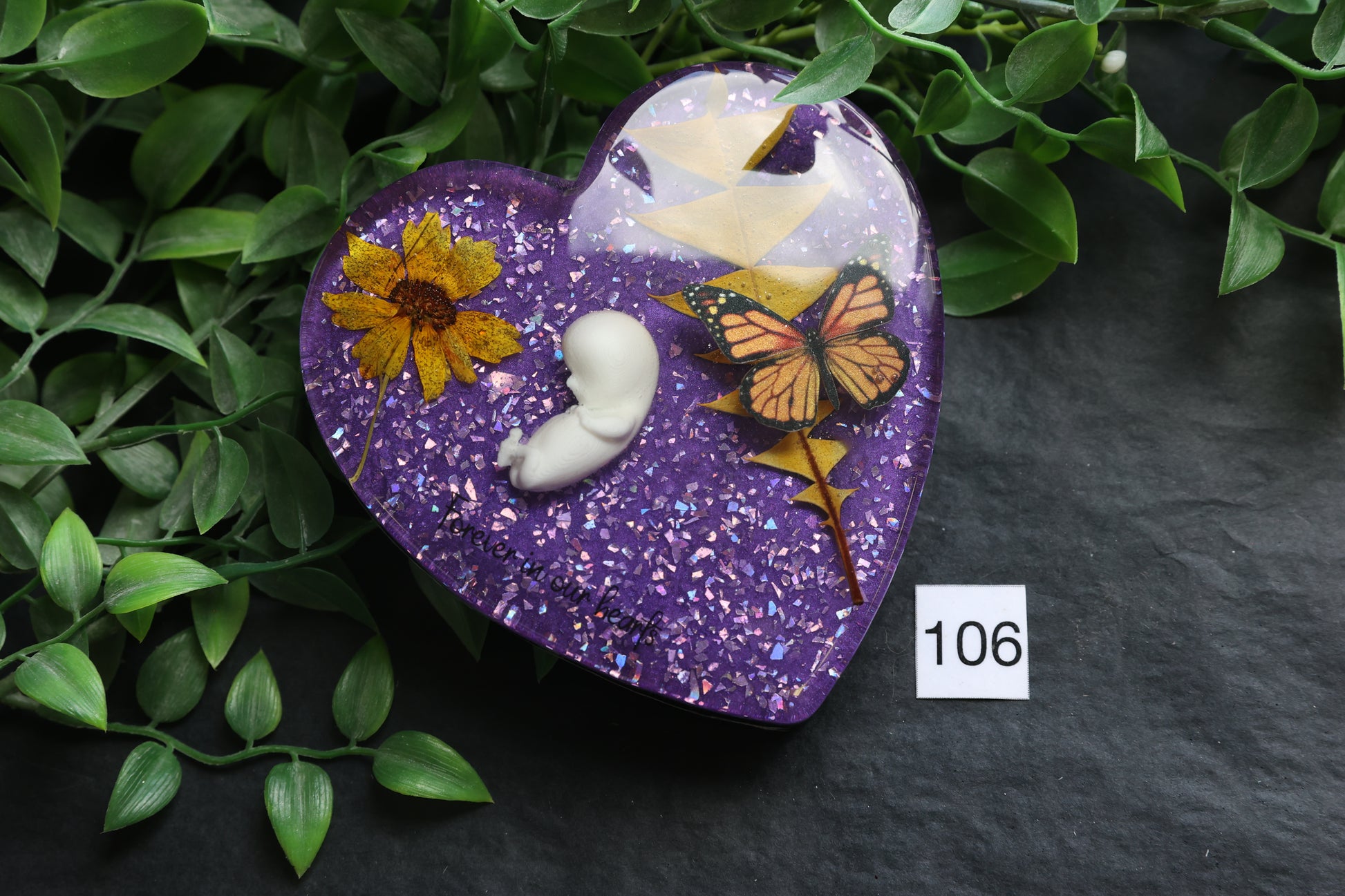 This beautiful piece is a remembrance piece, carefully crafted to represent the exact size of a 10 week baby at their gestational week inside a 4 inch heart. The back of each piece is flat, allowing it to be displayed in a shadow box or laid flat as a cherished keepsake.