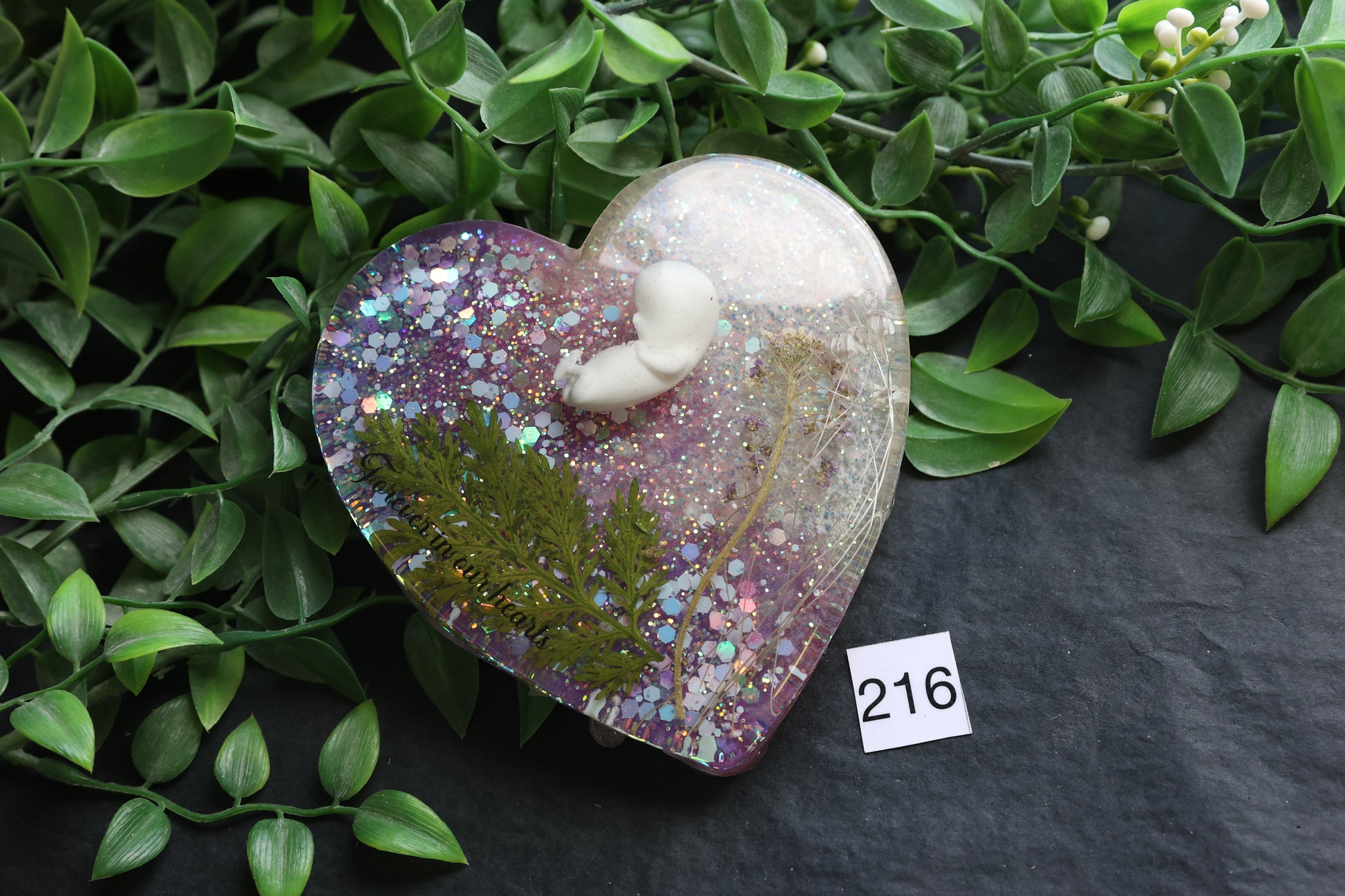 This beautiful piece is a remembrance piece, carefully crafted to represent the exact size of a 10 week baby at their gestational week inside a 4 inch heart. The back of each piece is flat, allowing it to be displayed in a shadow box or laid flat as a cherished keepsake.