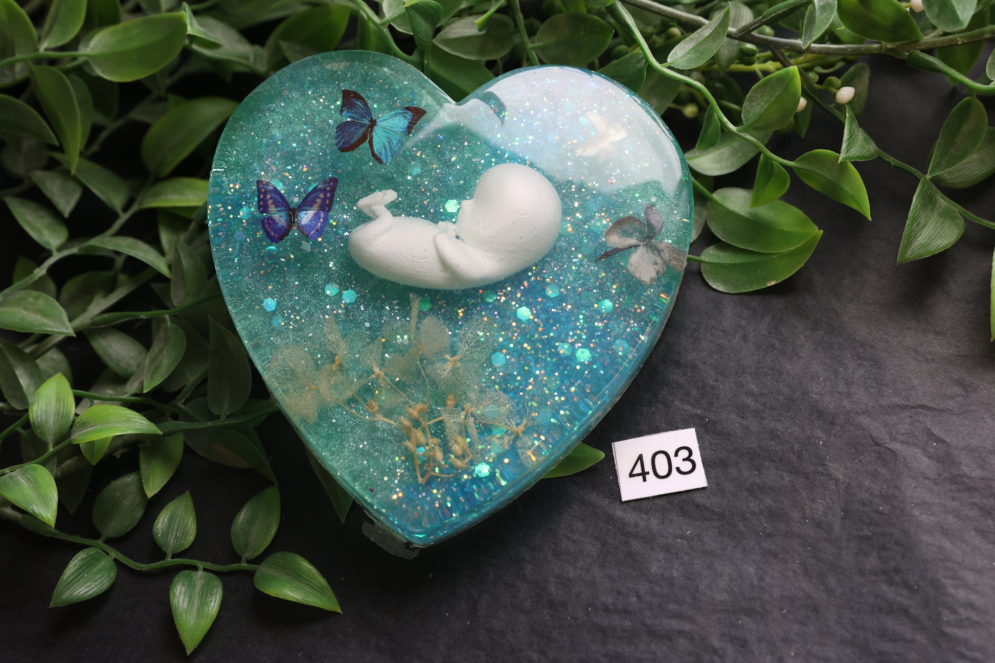 This beautiful piece is a remembrance piece, carefully crafted to represent the exact size of a 11 week baby at their gestational week inside a 4 inch heart. The back of each piece is flat, allowing it to be displayed in a shadow box or laid flat as a cherished keepsake.