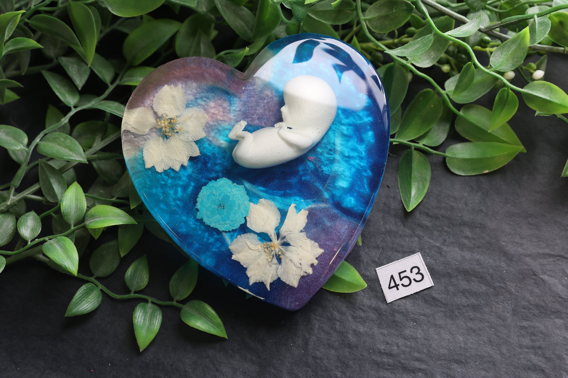This beautiful piece is a remembrance piece, carefully crafted to represent the exact size of a 11 week baby at their gestational week inside a 4 inch heart. The back of each piece is flat, allowing it to be displayed in a shadow box or laid flat as a cherished keepsake.